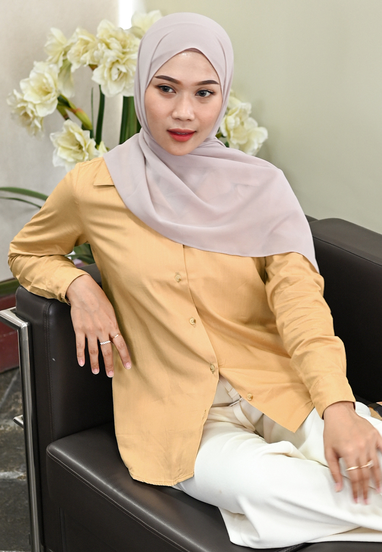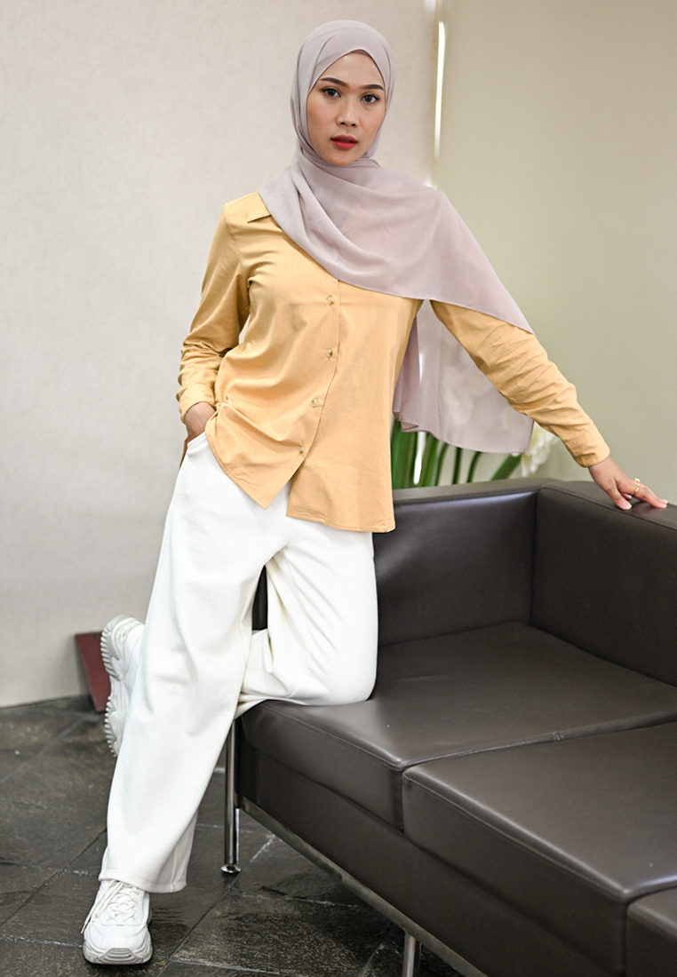 – Kemeja dengan siluet yang sedikit lebar.
